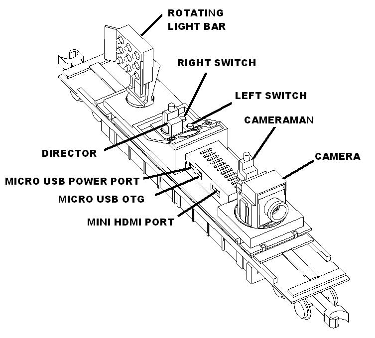 The camera train is a fun camera on wheels which rotates, tilts and takes videos and snapshots. It has a rotating spot light for night time illumination, a director, and camera man. The camera man is mounted on top of the camera so he can get the best shots. And the director is at the main control panel where he can give give orders to the camera crew.
