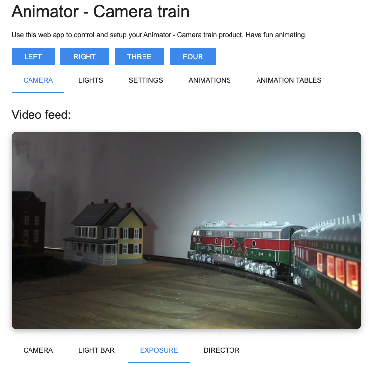 To access your camera train type in “animator-camera-train.local:8083” in your browser on your phone, tablet or computer. The following web page will be displayed.